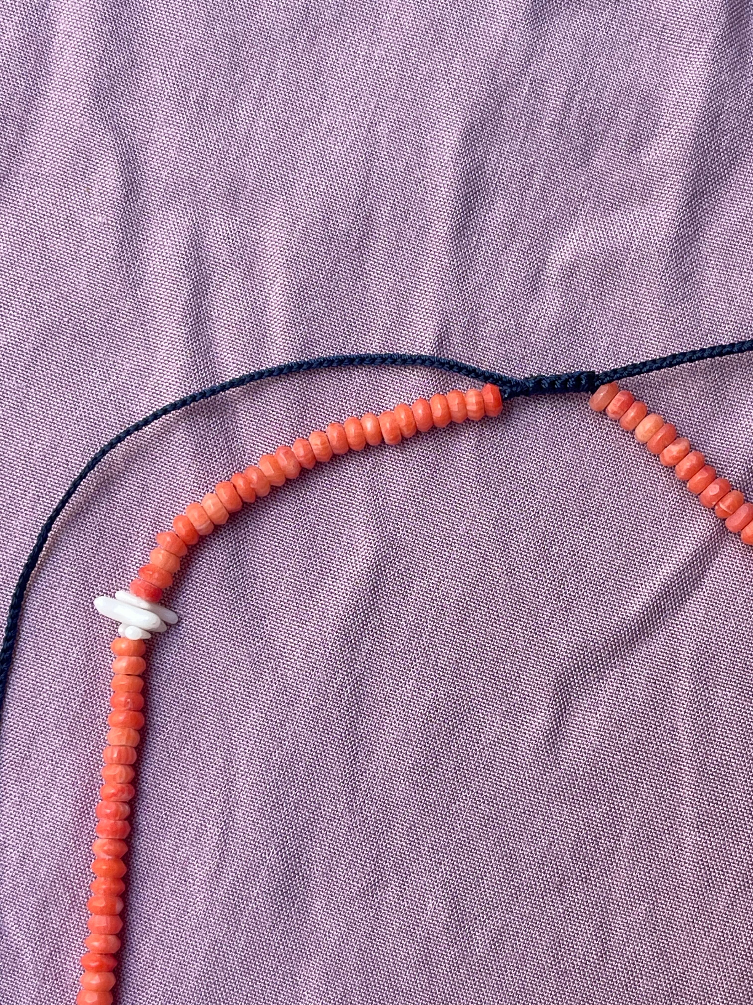 天然の珊瑚とシェルを組み合わせたこのチョーカーは、さりげない可愛さとナチュラルな雰囲気を漂わせています。